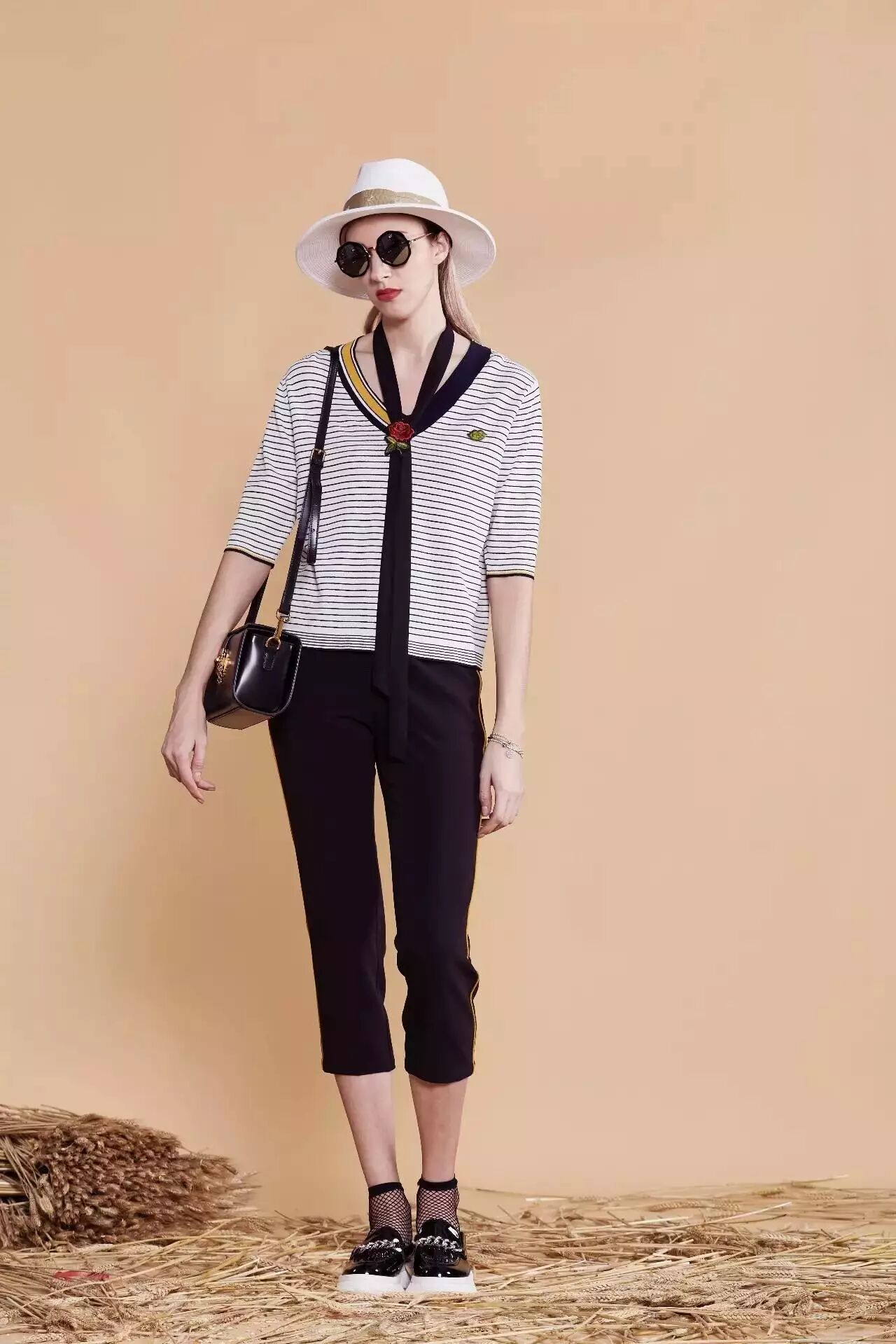 撞色V领的条纹毛织上衣,搭配撞色辑边哈伦裤,配饰女人色彩的玫瑰花飘带,帅气十足。
