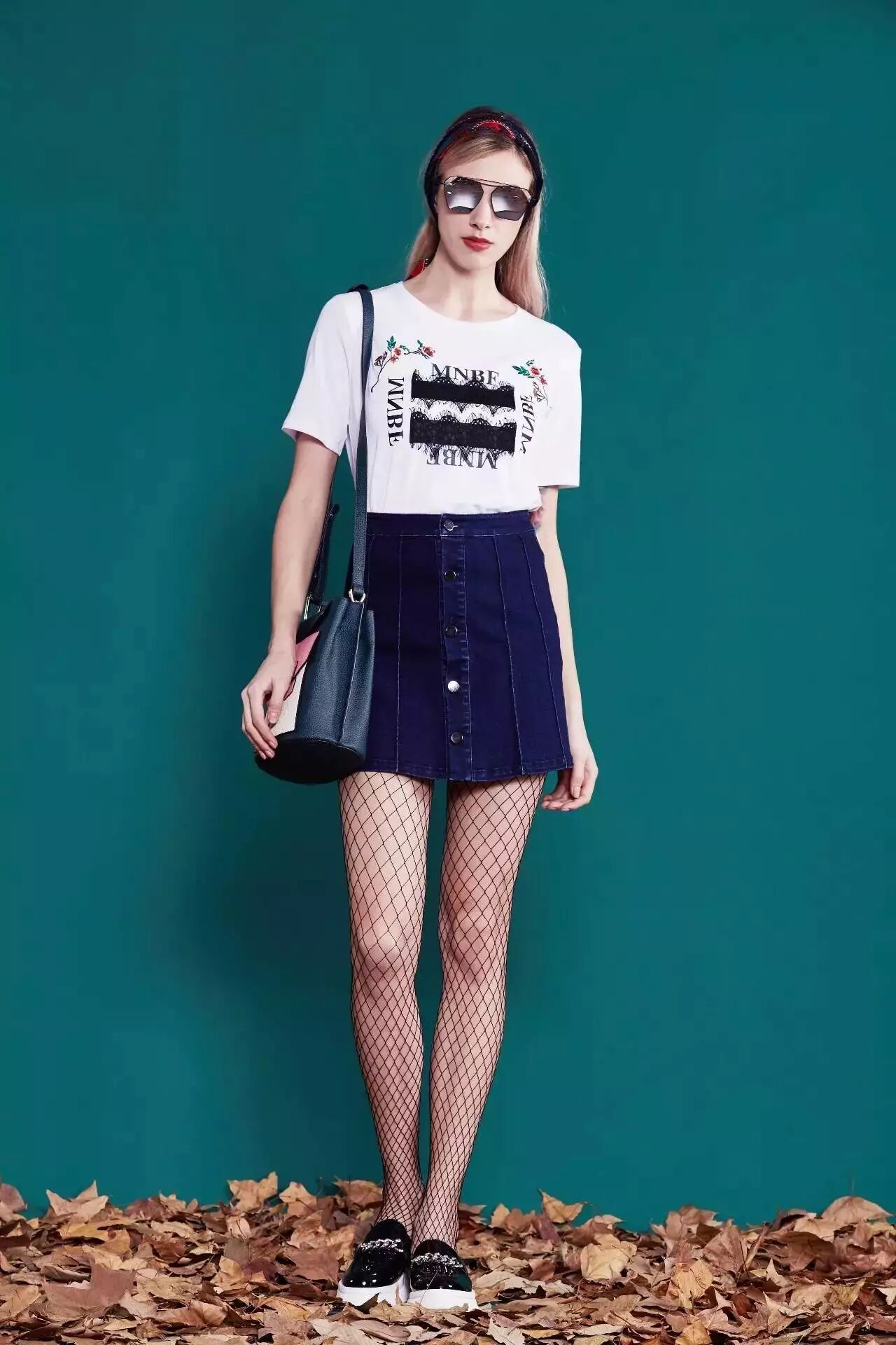 简单百搭的T恤廓形加上印花和绣花的工艺并利用面贴蕾丝为点缀,搭配经典的牛仔A字裙,时尚简约,不挑人。